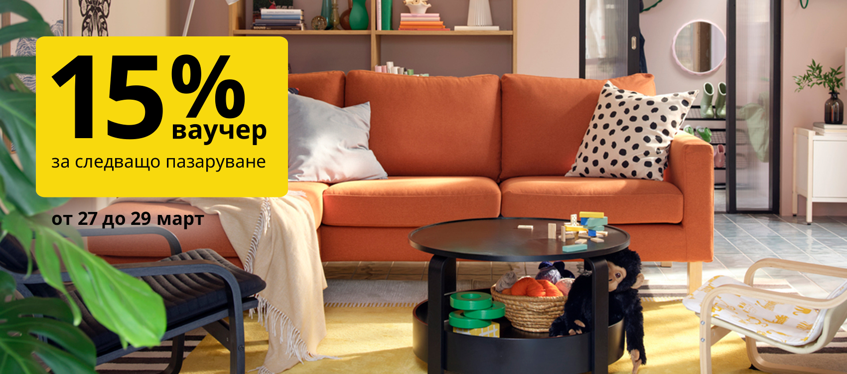 * При покупка на стоки от магазини ИКЕА гр. София и гр. Варна, ИКЕА Mall of Sofia, ИКЕА Мол Велико Търново, ИКЕА Перник Плаза, ИКЕА Центрове за поръчки гр. Пловдив и гр. Бургас, както и при направена поръчка от ИКЕА онлайн магазин и приложението IKEA Bulgaria, в периода от 27 март до 29 март 2026г., получавате 15% от реално заплатената сума за закупените стоки (след приспадане на евентуално използвани отстъпки/ваучери) като отстъпка, под формата на ваучер за следващо пазаруване във всички търговски обекти и канали ИКЕА.