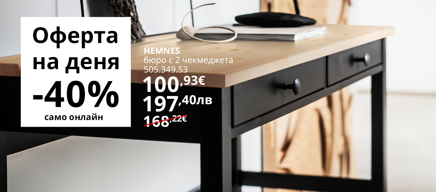* Промоционалната кампания е валидна на 12 февруари 2026г. при покупка на HEMNES бюро с 2 чекмеджета (артикулен номер 505.349.53), предлаган в ИКЕА онлайн магазин и приложението IKEA Bulgaria.