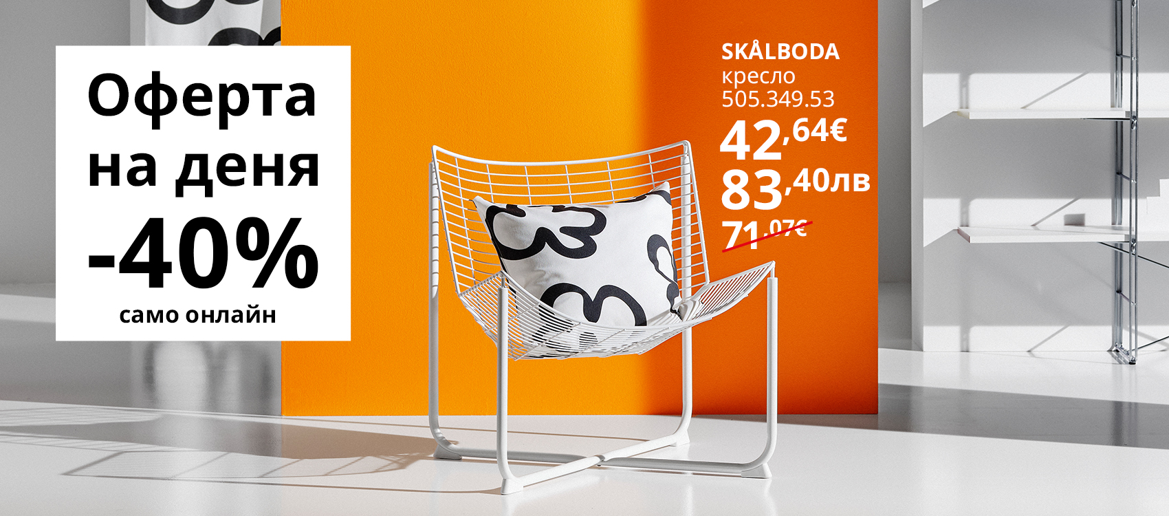 * Промоционалната кампания е валидна на 26 март 2026г. при покупка на SKÅLBODA кресло (артикулен номер 205.820.35), предлагано в ИКЕА онлайн магазин и приложението IKEA Bulgaria.