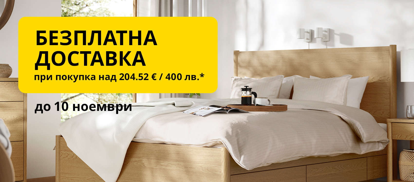 * Промоционалната кампания е валидна за периода от 24 октомври до 10 ноември 2025 г. при покупка на определени стоки от магазини ИКЕА гр. София и гр. Варна, ИКЕА Mall of Sofia, ИКЕА Мол Велико Търново, ИКЕА Перник Плаза, ИКЕА Центрове за поръчки гр. Пловдив и гр. Бургас, както и при направена поръчка от ИКЕА онлайн магазин и приложението IKEA Bulgaria, при реално заплатена сума за тях над 204.52 € / 400 лв. с ДДС (след приспадане на евентуално използвани отстъпки/ваучери).