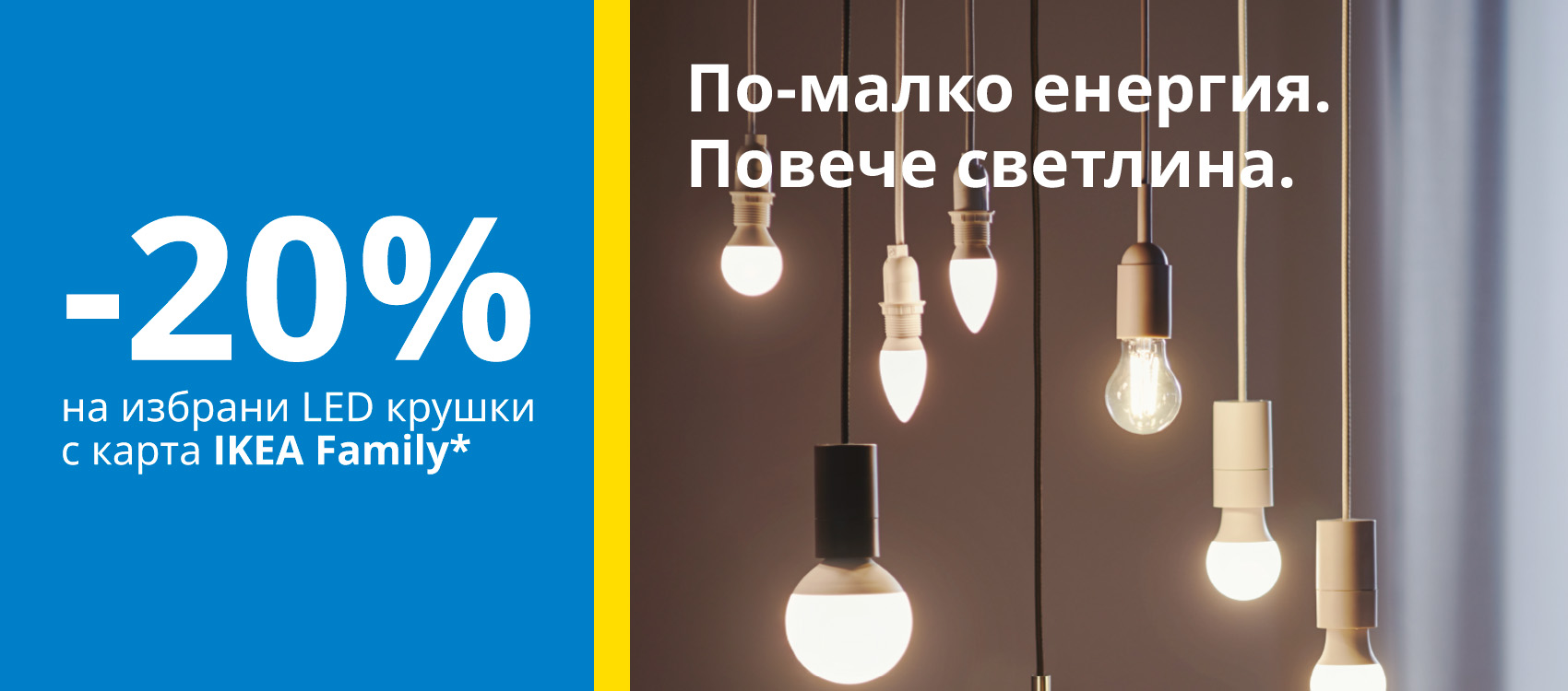 * Промоционалната кампания е валидна от 24 март до 29 март 2026г. по отношение на избрани, налични LED крушки, предлагани в магазини ИКЕА гр. София, ИКЕА гр. Варна, ИКЕА Mall of Sofia, ИКЕА Мол Велико Търново, ИКЕА Перник Плаза, ИКЕА Центрове за поръчки гр. Пловдив и гр. Бургас, ИКЕА онлайн магазин и приложението IKEA Bulgaria.