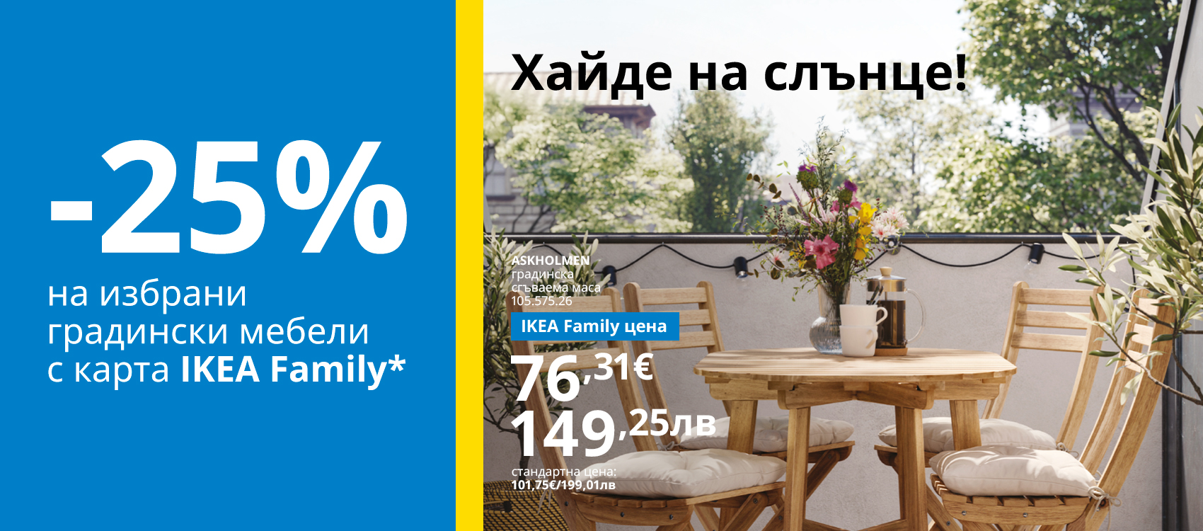 * Промоционалната кампания е валидна от 27 март до 09 април 2026г. по отношение на избрани, налични градински мебели, предлагани в магазини ИКЕА гр. София, ИКЕА гр. Варна, ИКЕА Mall of Sofia, ИКЕА Мол Велико Търново, ИКЕА Перник Плаза, ИКЕА Центрове за поръчки гр. Пловдив и гр. Бургас, ИКЕА онлайн магазин и приложението IKEA Bulgaria.