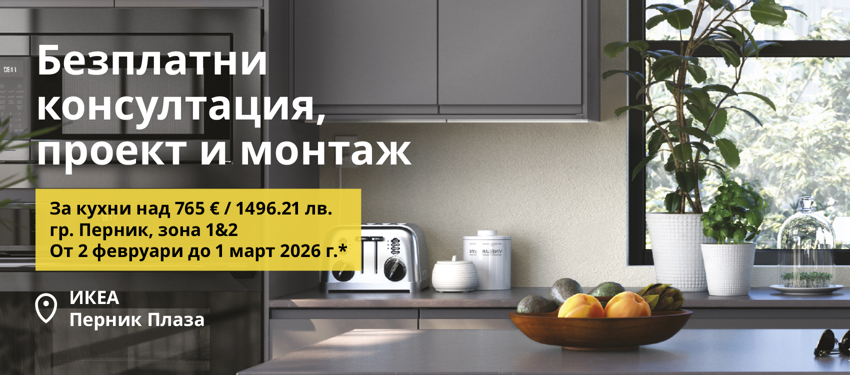 *При изготвяне на индивидуален проект за кухня и покупка на всички кухненски продукти METOD (в т.ч. кухненски шкафове, врати и чела, чекмеджета, телени кошници, рафтове, механизми, кухненски плотове, цокли, крака, лайстни, покривни панели и декоративни корнизи) от индивидуалния проект на обща стойност над 765 € / 1496.21 лв. с ДДС от ИКЕА Перник Плаза в периодa от 02.02.2026 г. до 01.03.2026 г., клиентът може да заяви безплатно услугата „Монтаж на мебели“ само за територията на Зона 1 и 2 на гр. Перник (П.К. 2340 2341 2345 2346 2350 2351 2348 2347 2349 2342 2352 2353 2300 2301 2302 2303 2304 2305 2306 2307 2308 2309 2359 2357 2343 2344 2358 2354 2355 2356 2386 2365 2388 2395 2383 2360 2385 2372 2397 2367 2398 2381 2393 2399 2371 2366 2379 2390 2370 2382 2396 2394 2373 2389 2384 2380 2387 2369 2378 2391 2375 2364 2376 2374 2377 2429 2431 2448 2450 2433 2451 2449 2436 2427 2453 2454 2407 2425 2416 2420 2413 2428 2430 2410 2426 2419 2415 2424 2421 2422 2409 2417 2406 2455 2452 2447 2400 2402 2403 2412 2414 2418 2411 2423 2432 2401 2435 2441 2457 2458 2434 2392 2459 2439 2444 2437 2408 2438 2443 2446 2456 2445 2440 2442 2466 2488 2467 2483 2486 2473 2492 2497 2490 2489 2464 2472 2480 2463 2491 2496 2487 2481 2494 2465 2474 2475 2477 2499 2471 2484 2493 2482 2460 2479 2468 2476 2495 2470 2485 2469 2478). За да се възползва безплатно от услугата, клиентът следва да заяви услугата „Монтаж на мебели“ до 01.04.2026 г. в отдел „Кухни“ в ИКЕА Перник Плаза.