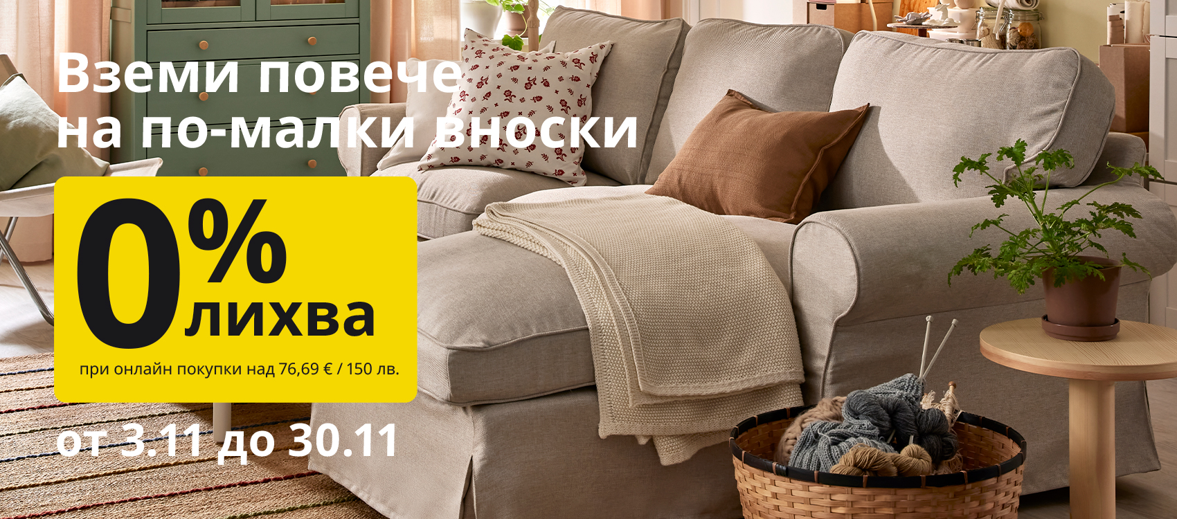 * Предложението е валидно само за физически лица, при кандидатстване за стоков кредит за покупка на стоки (при посочените по-долу изключения) на стойност не по-малко от 76,69 € / 150 лв. и не повече от 7 669,38 € / 15 000 лв. (реално заплатена сума, след приспадане на евентуално използвани ваучери/отстъпки и други подобни). Предложението е валидно за периода от 03.11.2025 г. до 30.11.2025 г. при направена поръчка от ИКЕА онлайн магазин и приложението IKEA Bulgaria.